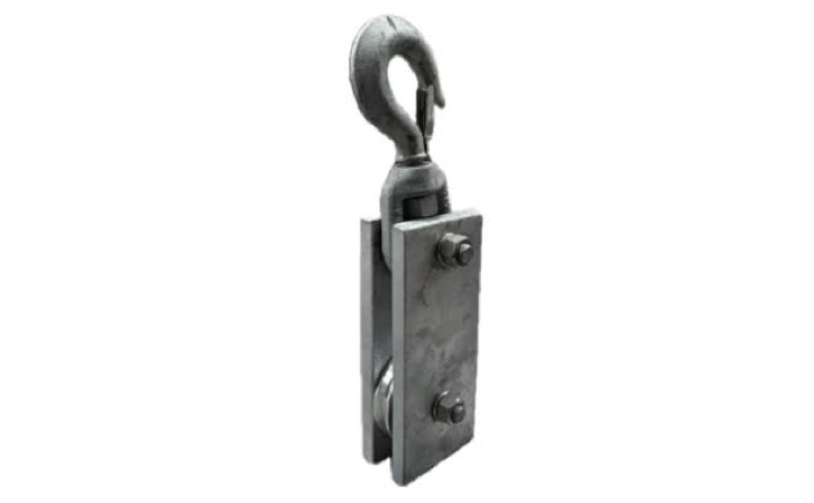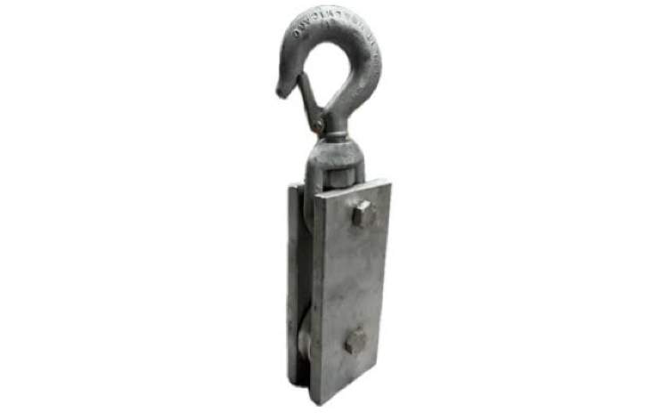 Snatch Block, galvanized, 2 part line application with 1 ton swivel hook with safety latch. 4" aluminum sheave.